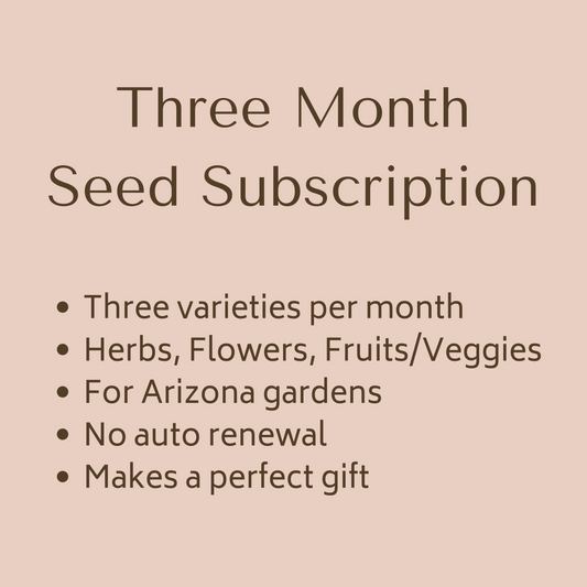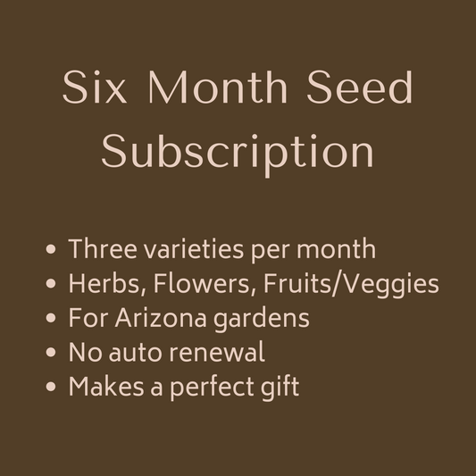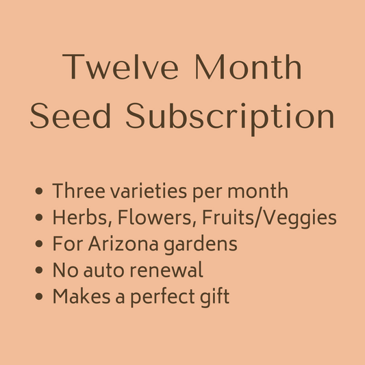 Growing a garden in the Phoenix valley has it's challenges! With a little care and know how, the most amazing gardens can thrive despite the harsh climate. Join the Fertile Desert club's subscription to receive seeds monthly that are appropriate to plant immediately upon delivery. No waiting for the proper season! Getting seeds planted every month ensures a beautiful garden year round, with new plants coming in while older ones reach the end of their lifecycle. I will be sending the seeds I am personally sewing in my own garden and you can follow along! Join me!